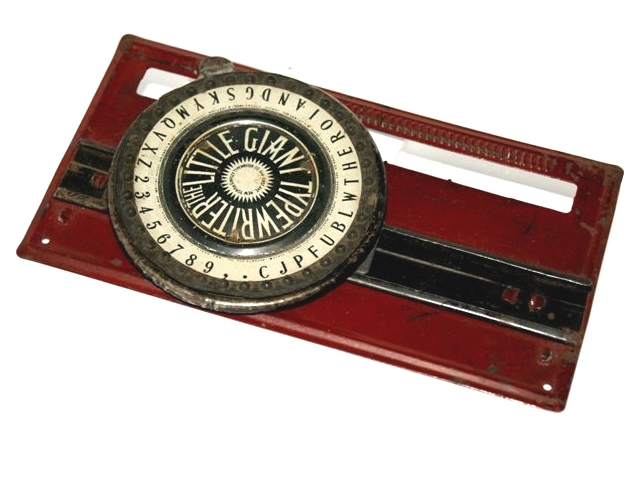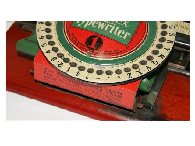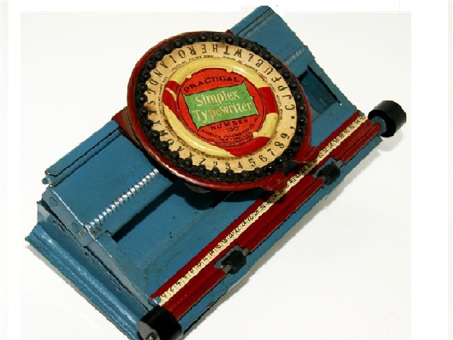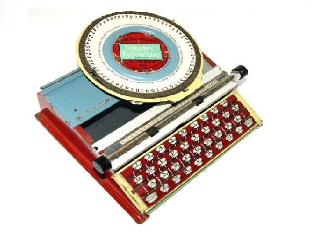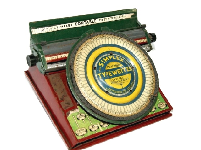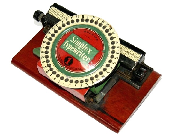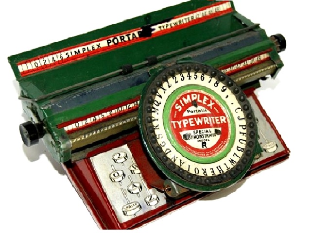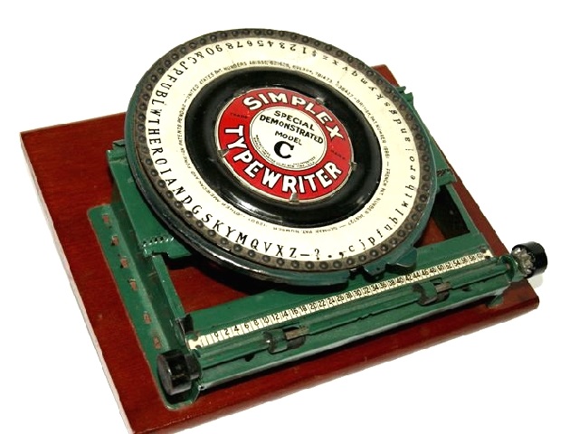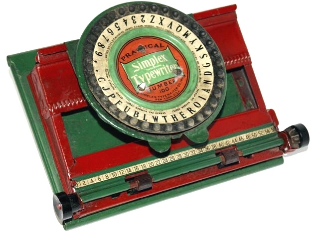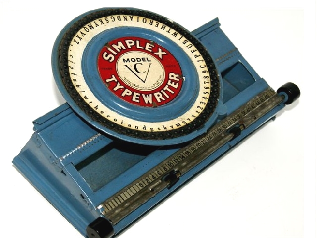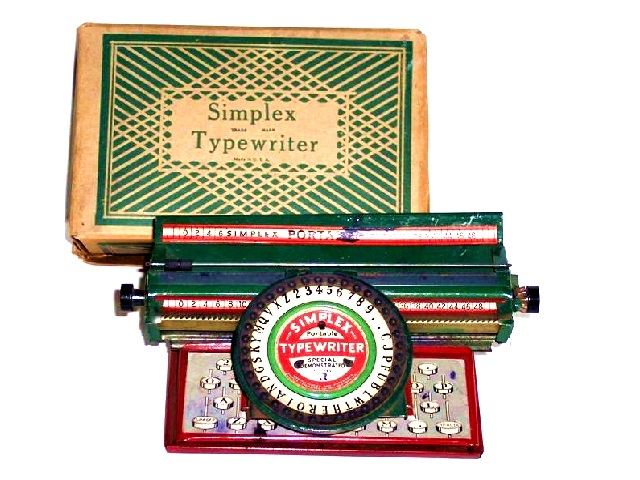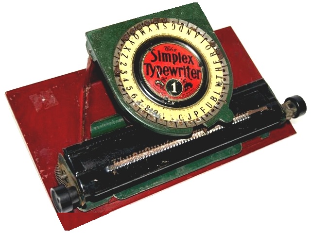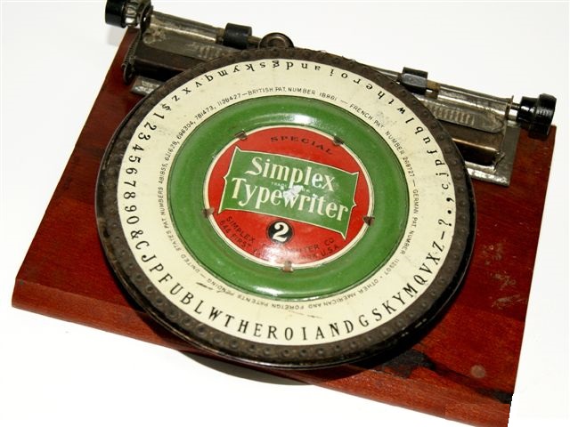 office machines of the day, they could not compete when typewriters became affordable. The first Simplex was a lovely thing, but over time they became variations on a simple design, employing a metal framework and a flat, circular dial. The dial included rubber letters and characters, sometimes all upper case, sometimes upper and lower. As the dial was rotated, the rubber letters passed against an ink roller. The user simply turned the dial until the desired letter was at the printing point, then pressed down on the dial. As the letter left its impression on the paper, the whole dial mechanism advanced one space. When the end of the