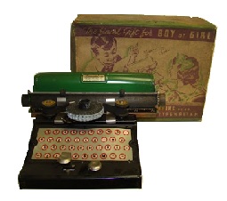 Though relatively common, the American Flyer toy typewriter often is found with the operating mechanism broken. This part is made from pot metal and is very easily broken into several pieces. Even though it may look brand new, it is inoperable so look to be sure you know if it is working or not. This one works great! Made between 1934 and 1937, it has a stamped steel body painted black, a paper letterpad with keys printed on it, a platen with black hexagonal plastic platen twirlers, and a green paper table. Just like real typewriters, it uses a ribbon that is wound on two wooden ribbon spools that have to be advanced manually. There is a paper bail with two rubber paper rollers, and a line gauge attached to the body of the typewriter. Thick metal paper pressure pieces keep the paper tight to the platen when advanced. There are ribbon guides attached to the index, which is black plastic and has upper and lower case letters as well as numbers and figures molded in. In its day, it was a big seller."