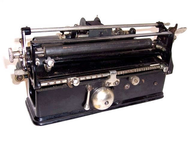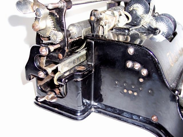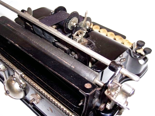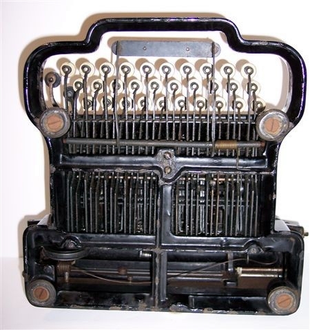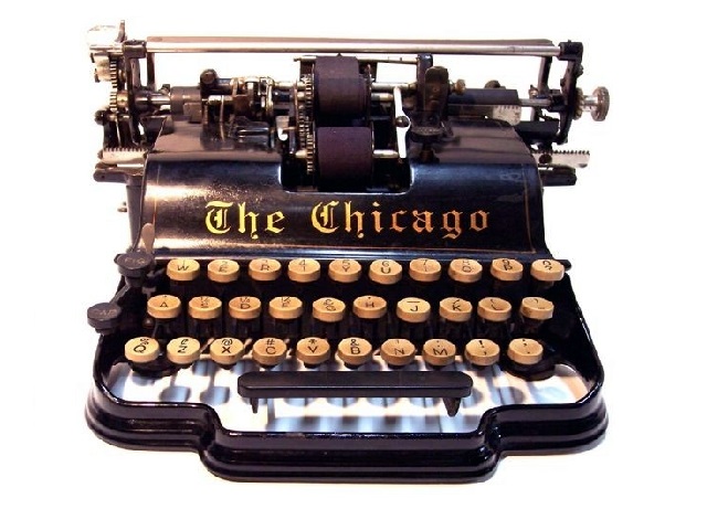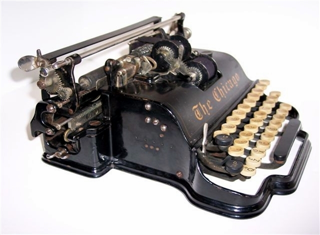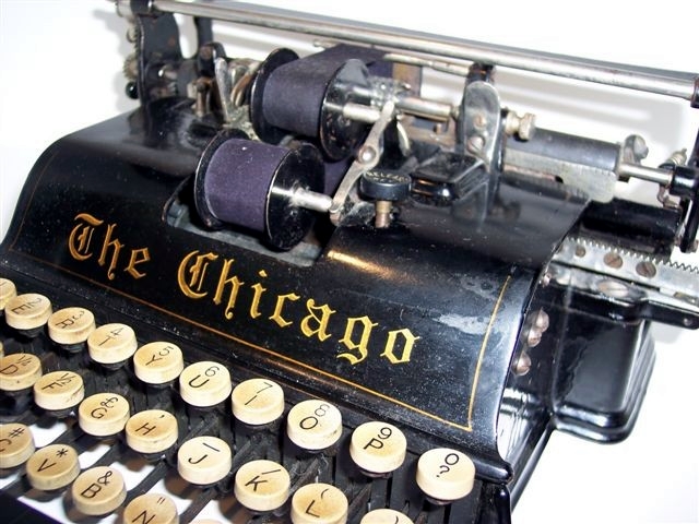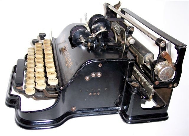 This Chicago typewriter was built 17 years into Chicago production, and in design varied most obviously from its predecessor, the Chicago 3, in its appearance. Operation of the Chicago has to be seen, really, to be believed as photos usually do not show the machine in its operating position as these pictures do.
