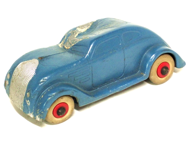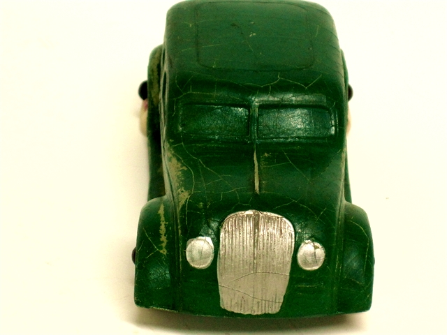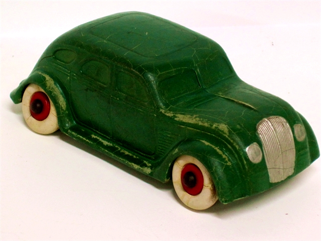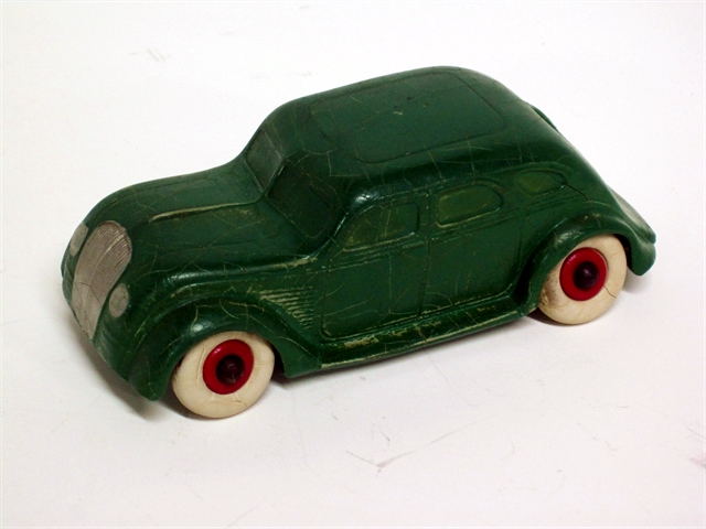 There aren't many rubber cars that have evaded identifications of their manufacturer(s), but that makes them all the more vexing in their stubborn anonymity. In the museum's collection there are three varieties of Airflow, the 1934 DeSoto 4-door Airflow, and the 1934 Chrysler two-door. Also in the unknown collection are several colors of what may be a 1947 Nash. In his amazing book, Dave Leopard writes that the Dodge and Plymouth cars and trucks thought for a long time to be by unknown makers were made by Perfect Rubber Toys.