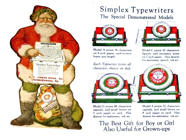office machines of the day, they could not compete when typewriters became affordable. The first Simplex was a lovely thing, but over time they became variations on a simple design, employing a metal framework and a flat, circular dial. The dial included rubber letters and characters, sometimes all upper case, sometimes upper and lower. As the dial was rotated, the rubber letters passed against an ink roller. The user simply turned the dial until the desired letter was at the printing point, then pressed down on the dial. As the letter left its impression on the paper, the whole dial mechanism advanced one space. When the end of the